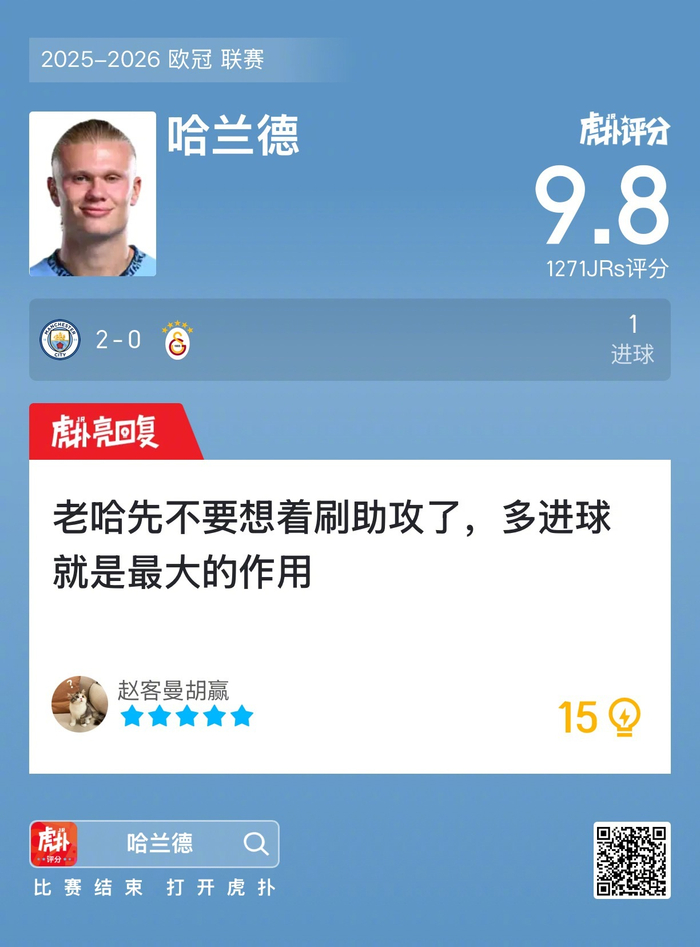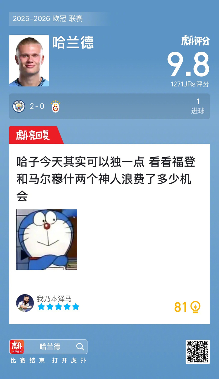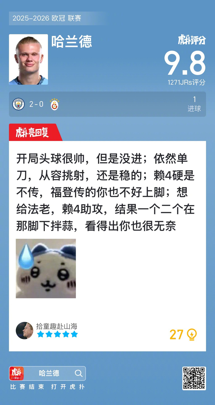 #曼城2比0加拉塔萨雷#哈兰德打进一球,赛后收获9.8的虎扑评分!
