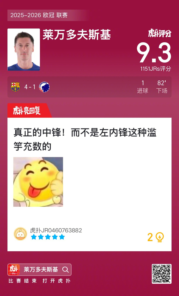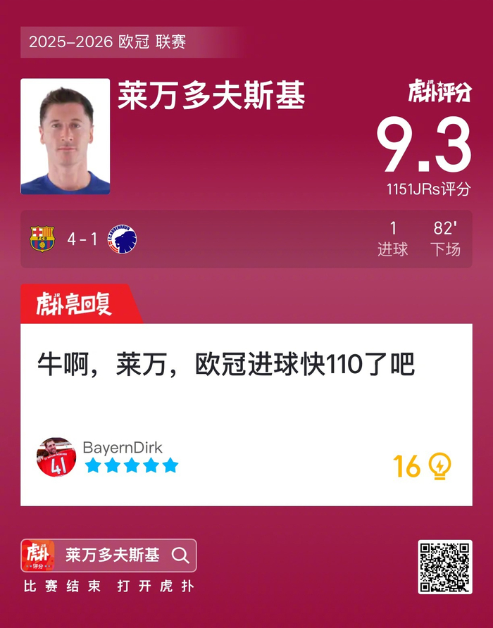 #巴萨4比1哥本哈根#莱万打进一球,赛后收获9.3的虎扑评分!