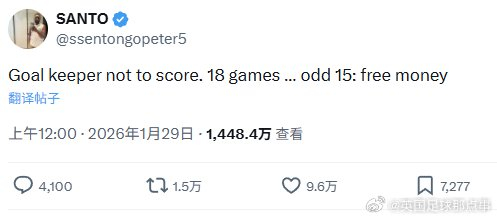 昨晚欧冠热帖:一位球迷赛前发文说“门将不进球,18场比赛,赔率15,简直是送钱。”后来的故事大家都知道了,最晚结束的一场,本菲卡门将特鲁宾在伤停补时97分钟头球破门……这条帖子迅速爆火,阅读量逼近1500万