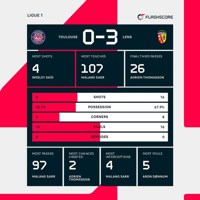 毫不奇怪,联赛领头羊在上半场加大了压力。加尼乌和赛义德都在角球区头球破门,前者头球破门,后者迫使纪尧姆·雷斯特斯在低位做出了一次伟大的扑救。 图卢兹然后减少到10人时,埃默森产生了一个可怕的挑战奥德松爱德华,但镜头无法利用半场结束前。不过,客队受到定位球的威胁尤其大,安德里亚·布拉托维奇抓住了任意球,然后迫使雷斯特斯再次漂亮地停下来。 凭借着人的优势,下半场没过多久,朗斯就终于找到了突破口。赛义德在第一节差点进球,这次他没有犯错,因为他对球从门柱上弹回并破门的反应最快。 赛义德随后几乎用另一个子弹头确保了得分,但他再次只能将球指向几英寸之外。 然而,阿德里安·帕拉松成功地完成了他的队友无法完成的任务,因为另一个篮板落在了禁区内的一名朗斯球员身上,这名31岁的球员将球送出。 加尼乌完成了进球,几乎是比赛的最后一个进球,他有力地击败了雷斯特斯,以确保客队仍然是本赛季唯一一支在法甲(W13)的胜利位置上落后一分的球队。 图卢兹的痛苦更是雪上加霜,西迪贝在死亡时因重伤被担架抬下,结束了他们在所有比赛中的三连胜。