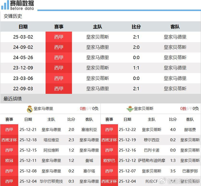 第一:两队情况!西甲17轮战罢,皇马13胜3平2负积42分,落后本轮先赛的巴萨多达7分排名第二;贝蒂斯7胜7平3负积28分排名第六,落后前五欧冠区多达5分。上轮西甲,皇马主场2-0力克塞维利亚,取得联赛两连胜,罗德里戈助攻+造点;贝蒂斯主场4-0横扫赫塔费,终结2轮不胜。