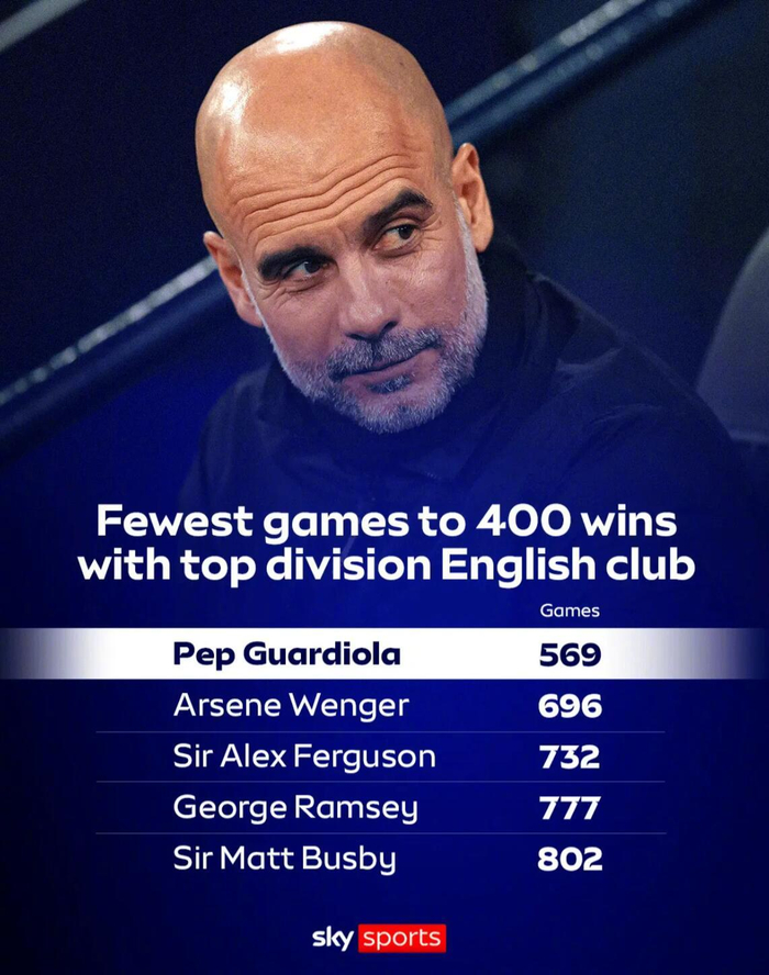 至此,他也成为了英格兰顶级联赛历史上收获400胜所用场次最少的主教练。