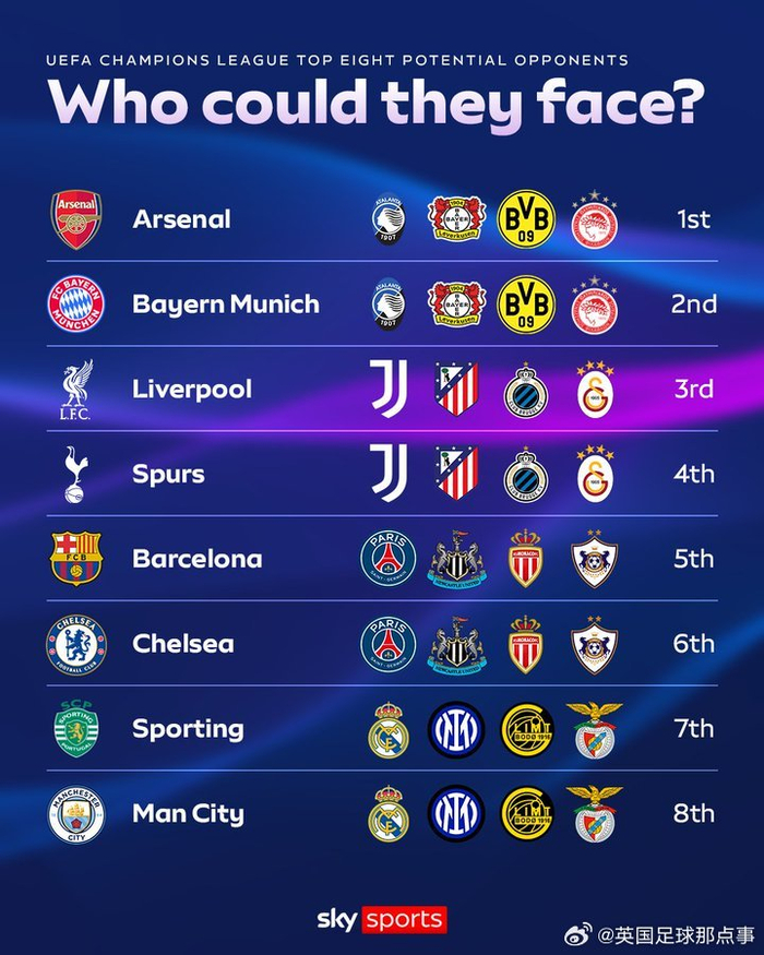 欧冠联赛阶段前8名在16强中可能遇到的对手,你希望你的主队碰到谁?👀