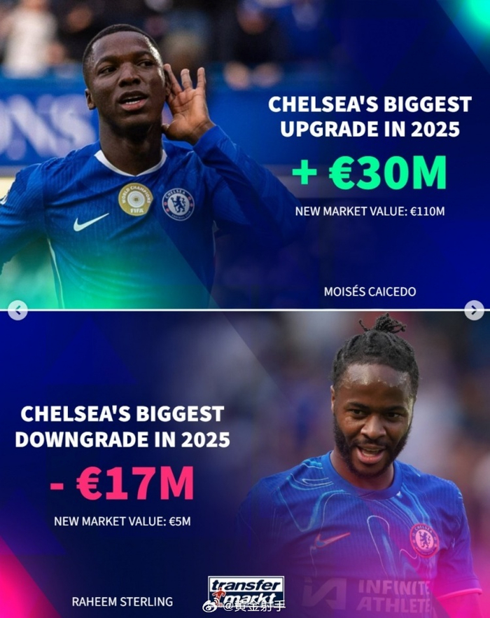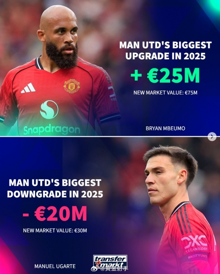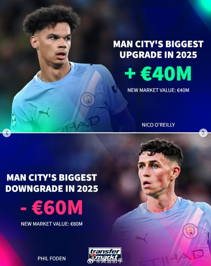 #曼城[超话]# 2025年已经过去,《转会市场》也统计了9大豪门的年度身价上涨和下跌最多球员情况。