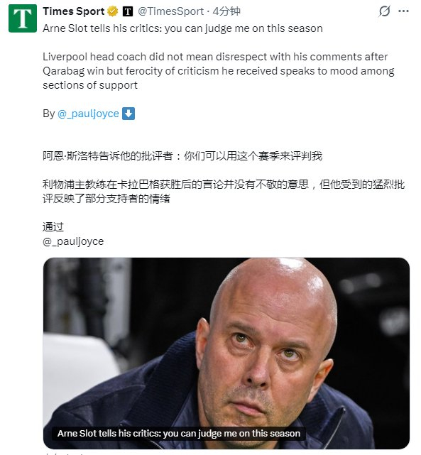 显然,斯洛特也听到了外界那些被他称作“杂音”的质疑,但这位47岁的荷兰教头始终保持着豁达的心态。当被问及是否觉得自己八个月前刚率队夺冠,理应得到更多尊重时,他并未借机表达不满。