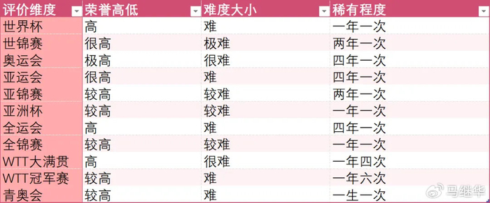 在这个角度上看,奥运会、亚运会、全运会的比赛都是四年一次,显然就比世乒赛的两年一次、世界杯的一年一次以及大满贯的一年四次的冠军要珍贵稀有。