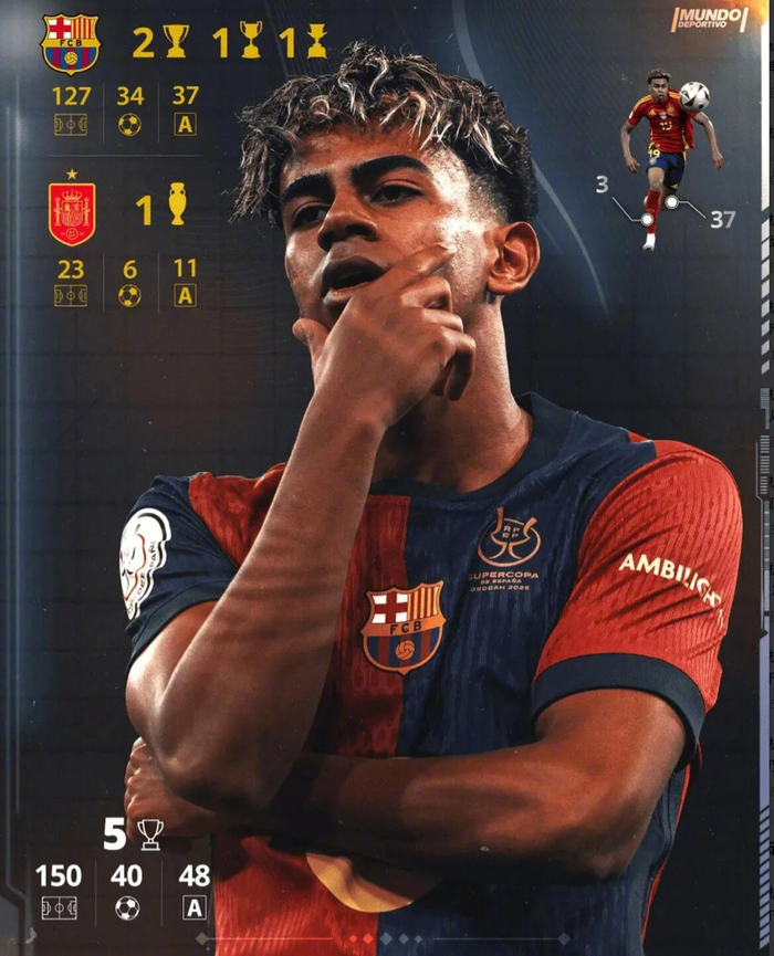 #西班牙人0比2巴萨# 据西班牙媒体《世界体育报》赛后的统计,18岁亚马尔达成职业生涯150场比赛里程碑,其中巴萨127场34球37助,西班牙队23场6球11助。