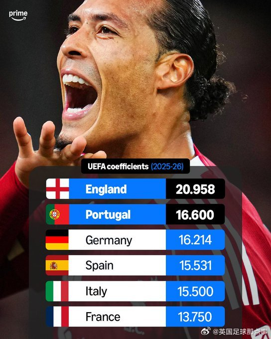 本赛季三级欧战联赛阶段全部结束,欧总联官网更新欧战系数积分:英超断层排名第一!
