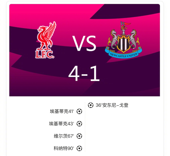 战报:#利物浦4比1纽卡斯尔联# ,维尔茨传射,埃基蒂克双响!