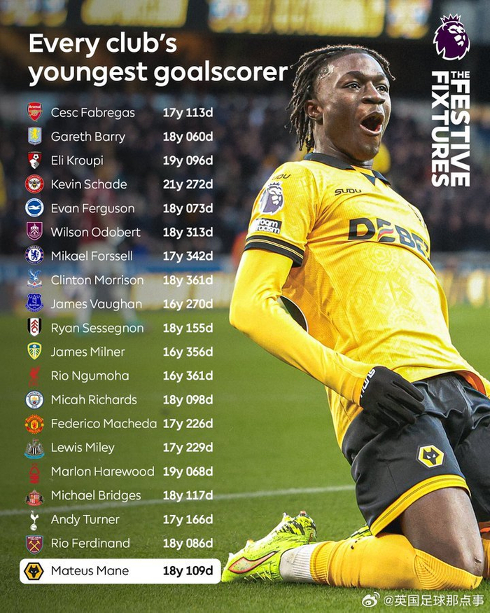 官方:马特乌斯·马内成为狼队历史上最年轻的英超进球者!👶👏#狼队3比0西汉姆联#