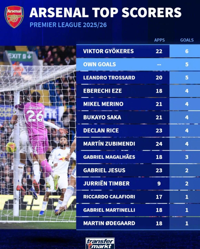 德转统计了本赛季英超阿森纳射手榜。
