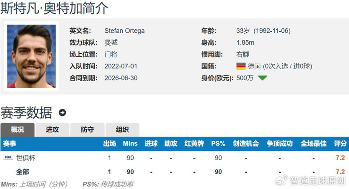 奥尔特加现年33岁,身高1.85米,右脚门将,与曼城还剩下5个月的合同,本赛季没有获得任何出场机会,仅在今年夏天的世俱杯中出场一次,取得零封。