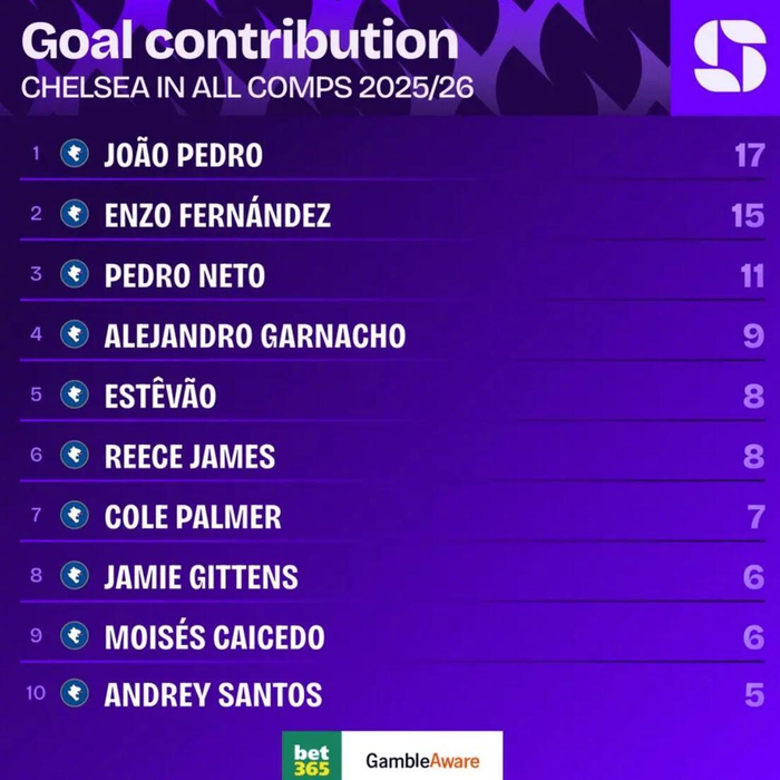 Squawka统计了切尔西本赛季的队内参与进球榜,详情如下: