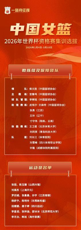 #中国女篮公布15人集训名单#为备战2026年国际篮联女篮世界杯资格赛,中国篮球协会将于2026年1月4日起在北京体育大学组织国家女篮集训选拔工作。15人集训名单于12月31日公布,在海外联赛效力的两大中锋李月汝和韩旭入选。入选集训名单的运动员是张茹、陈玉婕(山西),刘禹彤(上海),罗欣棫、张曼曼、孙宇(江苏),杨舒予、陈明伶(东莞),田媛媛、唐子婷(四川),李星诺、张梓涵、邵冰冰(北京师范大学),李月汝、韩旭(海外联赛)。