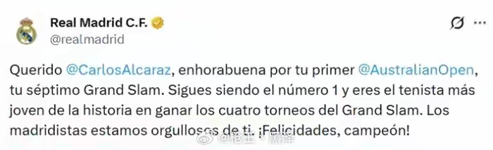 皇马官方写道:“亲爱的@阿尔卡拉斯,祝贺你首夺澳网冠军,收获生涯第7座大满贯奖杯!你依然稳居世界第一,更成为了史上最年轻的‘全满贯’选手。我们皇马人以你为荣。恭喜你,冠军!”