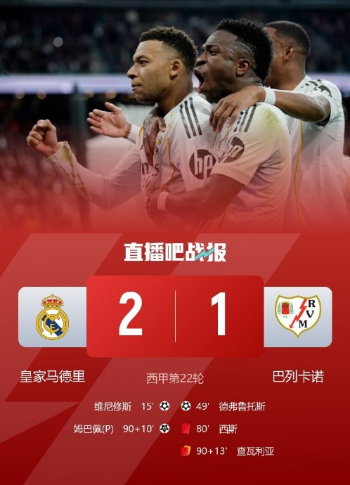 姆巴佩争议绝杀:第68分钟空门中柱,补时第98分钟点球命中助皇马2-1险胜。裁判未判其禁区内倒地(被质疑假摔),且巴列卡诺补时两黄变一红9人应战。