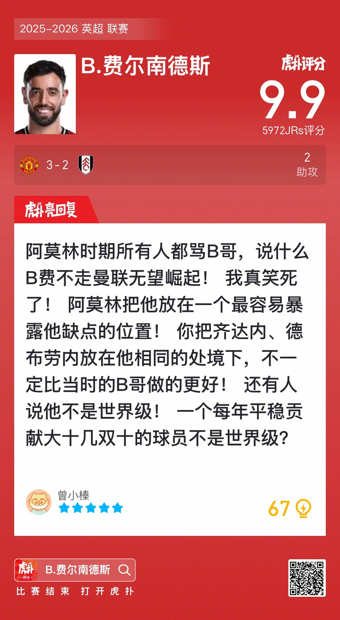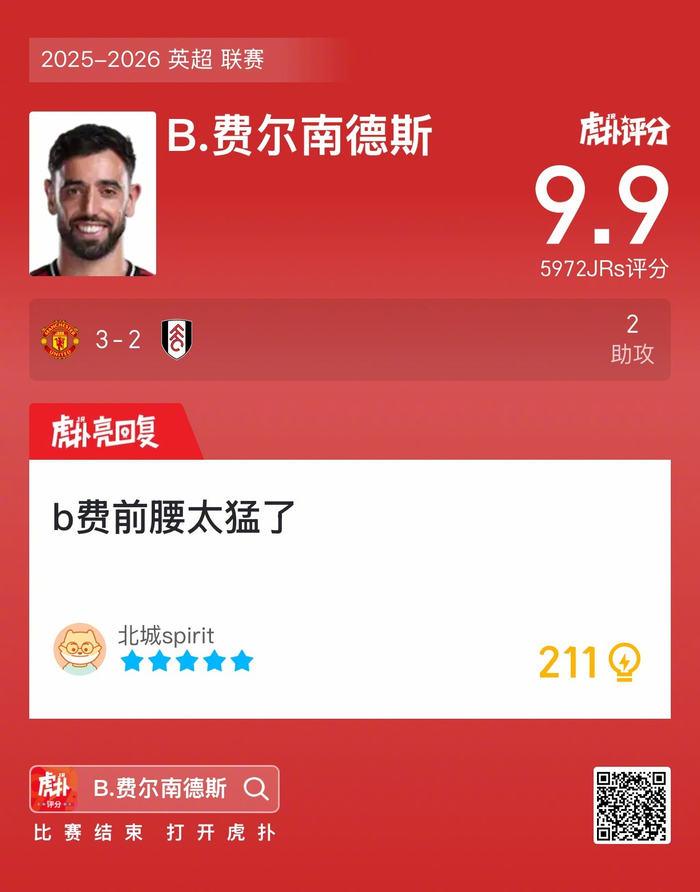 #曼联3比2富勒姆#B费贡献两次助攻,这场他发挥如何?