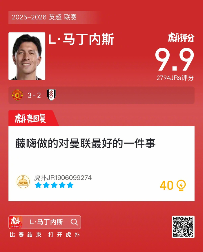 #曼联3比2富勒姆#利桑德罗-马丁内斯赛后收获9.9的虎扑评分!