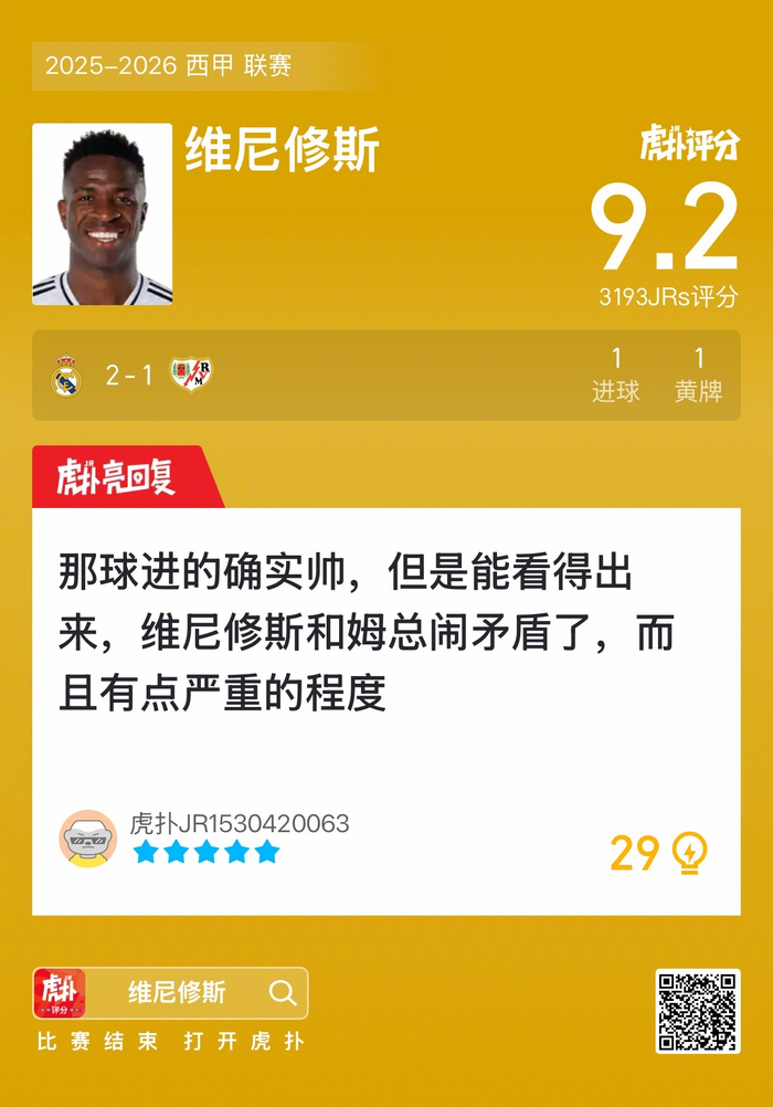 #皇马2比1巴列卡诺#维尼修斯打进一球,赛后收获9.2的虎扑评分!