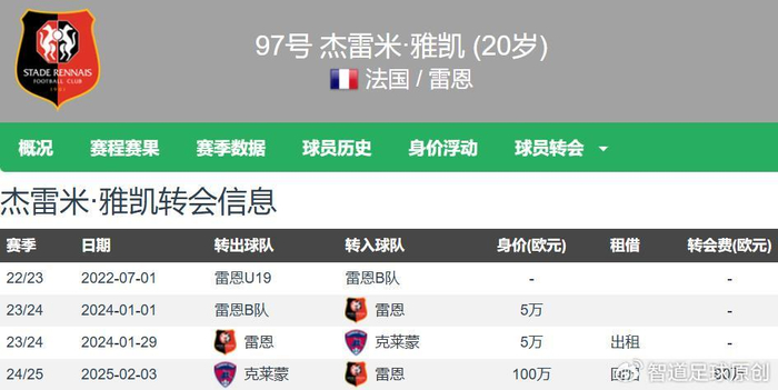 雅凯出自雷恩青训,球员曾外租至克莱蒙效力,去年冬窗回归雷恩,目前雷恩一线队生涯各项赛事有过31次出场,送出1次助攻。