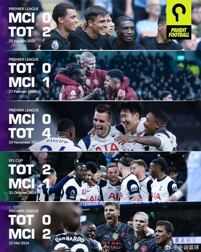 曼城对阵热刺取得客场两连胜,上一次三连胜还是1974年,52年之前!瓜迪奥拉执教生涯8次联赛输给热刺,是他输球最多的对手,没有之一。