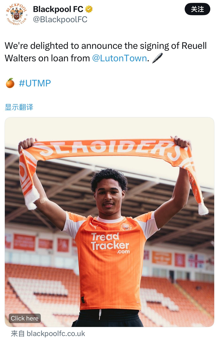 官方:前阿森纳青训后卫沃尔特斯被卢顿外租至黑池📝