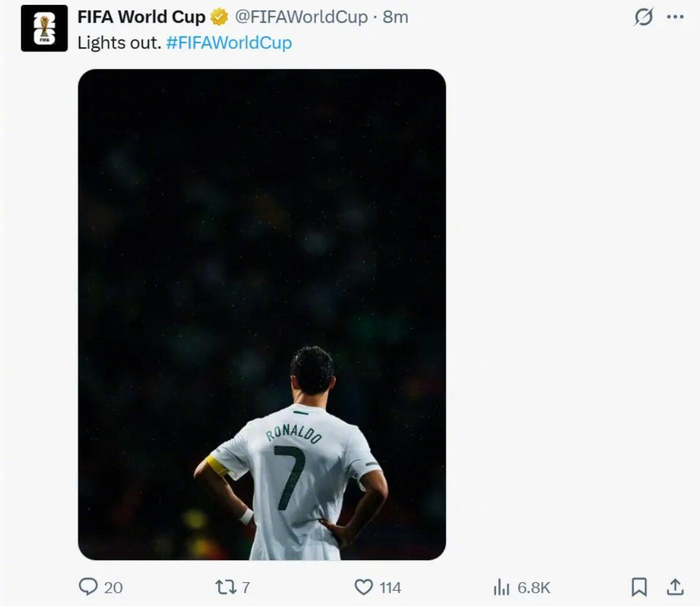 世界杯官方账号发布了一张C罗的背影照,并配文:灯熄灭了(Lights out.)