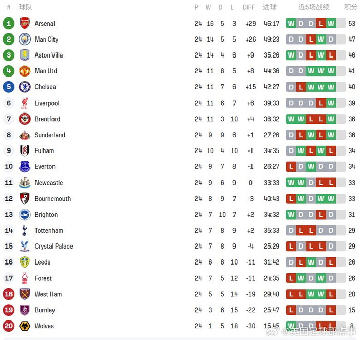 【积分榜】英超24轮全部结束!大家对主队本轮的表现满意吗?#英超联赛#