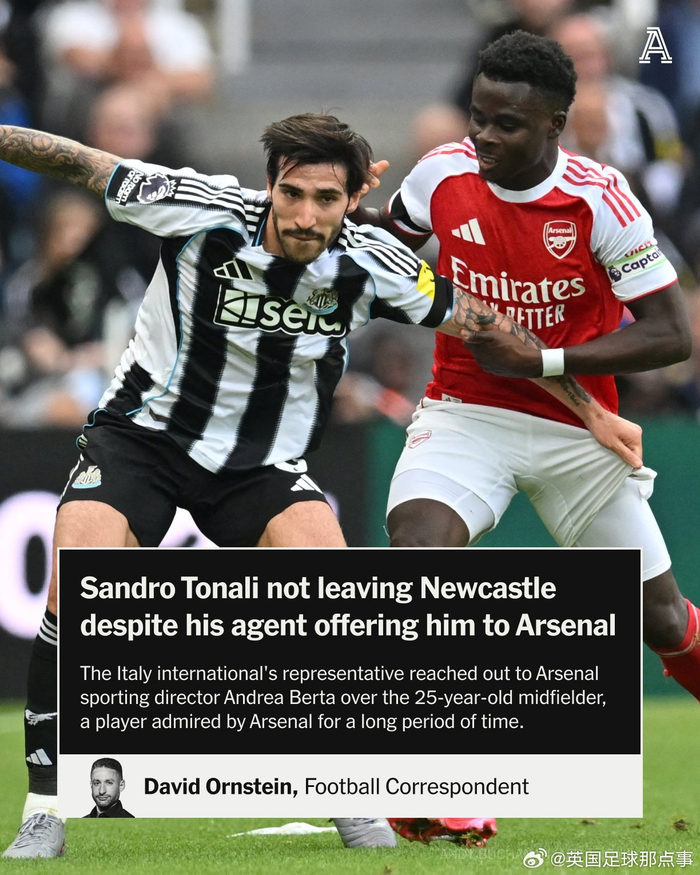 DO透露托纳利与阿森纳转会传闻的幕后消息:托纳利的经纪人向阿森纳总监贝尔塔推荐了他,阿森纳对此进行了考察,但没有与纽卡斯尔联队取得联系。直到关窗都没有进一步推进。