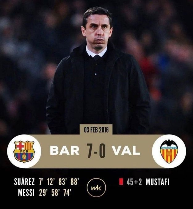 10年前的今天,加里·内维尔执教的巴伦西亚队以0-7惨败给巴塞罗那队。
