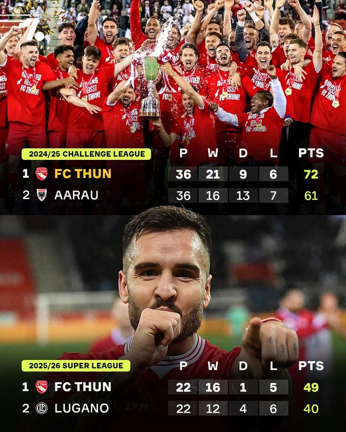 图恩队本赛季升入瑞士超级联赛,目前位居瑞士超级联赛榜首,这意味着他们有望连续两年赢得联赛冠军,并首次捧起超级联赛奖杯🏆🏆