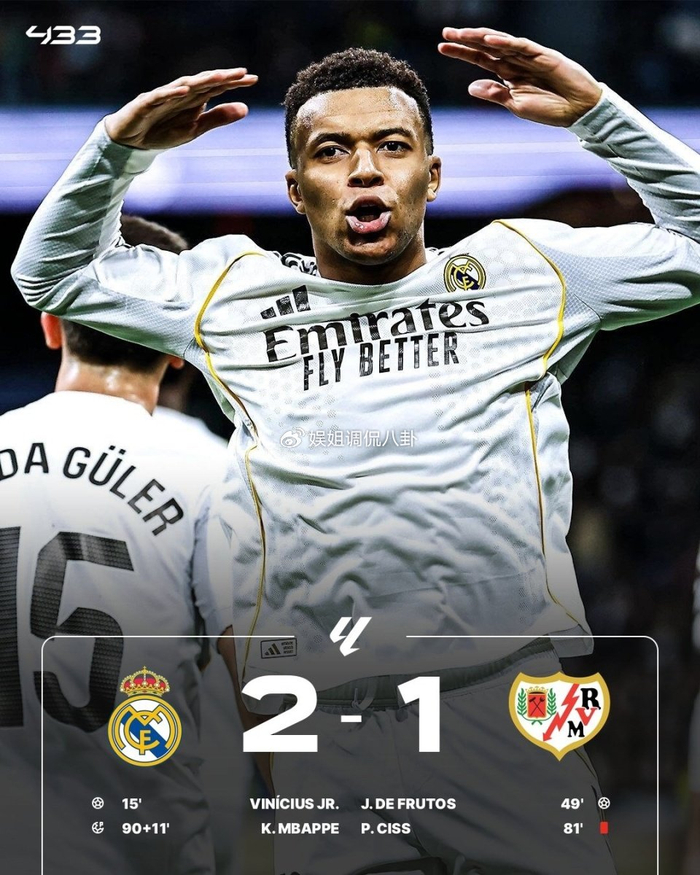 西甲第22轮,皇马主场2-1险胜九人巴列卡诺,取得联赛6连胜,距榜首巴萨1分。贝林厄姆伤退泪洒赛场,维尼修斯1V3破门+终结联赛13轮球荒,德弗鲁托斯扳平,库尔图瓦扑单刀,西斯蹬踏直红,姆巴佩失空门+读秒点射绝杀,查瓦利亚终场前染红。
