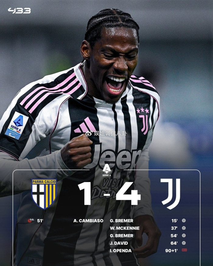 尤文图斯客场4-1击败帕尔马,2分优势超越少赛一场的罗马升至第4位。布雷默、麦肯尼先后破门,孔塞桑射中横梁,坎比亚索自摆乌龙,布雷默、戴维下半场帮助尤文锁定胜局。