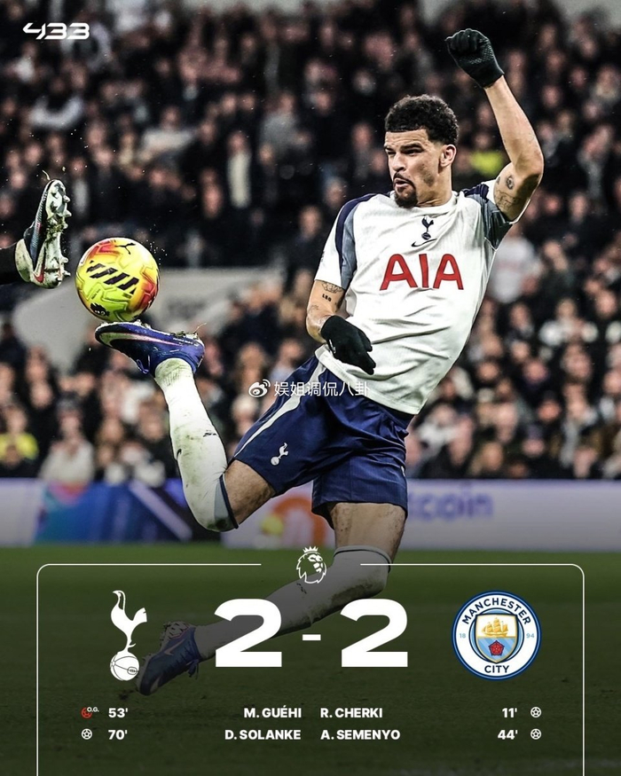 曼城客场2-2战平热刺,6轮仅1胜积47分位居第2,距榜首阿森纳6分。热刺联赛6轮不胜,积29分名列第14。谢尔基首开纪录,塞梅尼奥扩大比分,哈兰德和B席助攻,索兰克双响+蝎子摆尾扳平。