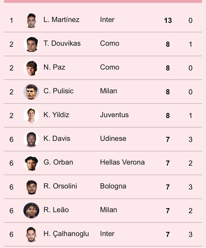 【意甲射手榜】 2025-26赛季#意甲联赛# 第23轮射手榜。👟#sempremilan#
