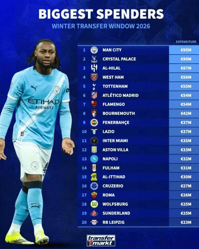 德国转会市场盘点了在今年冬季转会窗口支出最多的俱乐部,排名前20的球队花销情况如下: