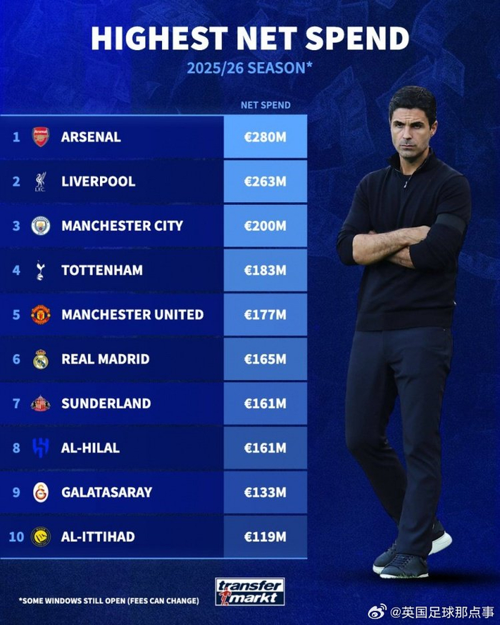🤑德转统计本赛季净支出最高球队排行榜:英超包揽前五
