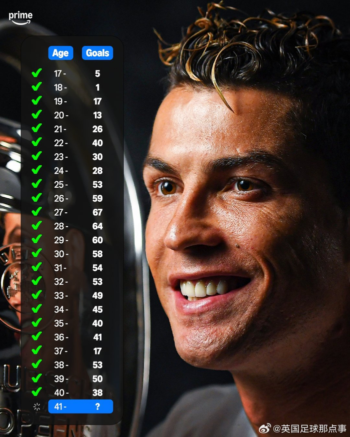 PrimeSport晒出C罗每个年龄的进球数,目前总计961球!🤯⚽️