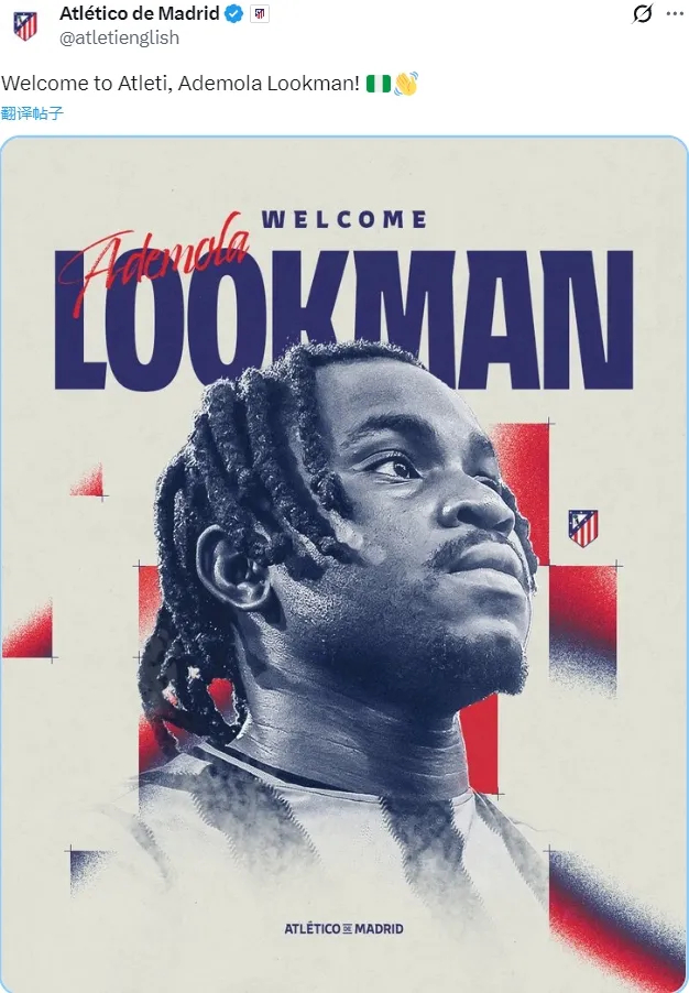 官方:马竞宣布从亚特兰大签下了28岁的卢克曼,双方签署了一份2030年到期的合同。