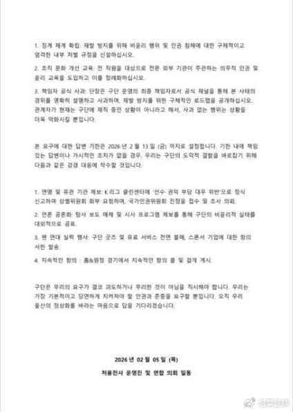 对此,处容战士进一步提出了对蔚山俱乐部的宽限时间,表示:“我们给俱乐部的期限是在2月13日之前,若在期限内俱乐部没有负责任的答复或可见的措施,为纠正俱乐部的道德缺陷,我们将采取强硬应对措施,包括向联盟及相关机构举报、诉诸媒体舆论、举行球迷联合抗议活动、持续抗议等。俱乐部必须正视此事件,我们的要求绝非过分或无理。我们只是要求那些最基本、理所当然应得到保障的人权和尊重。"