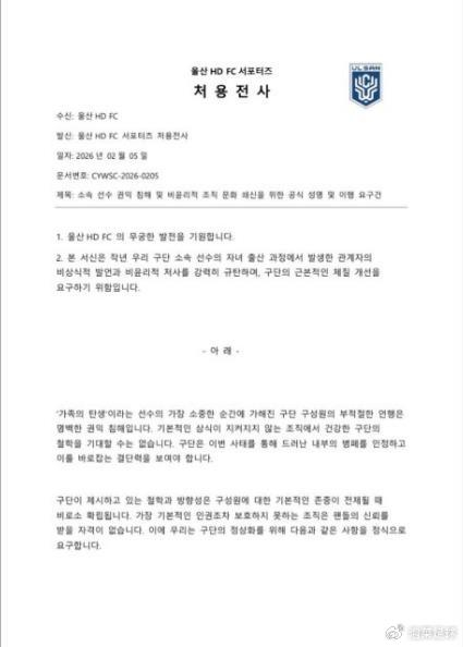1月27日,我们曾经报道了高丞范在2025年夏天换帅后,和俱乐部产生的一些冲突起因,并且报道了蔚山管理层对高丞范及家人的侮辱以及高丞范现在转会的困境。事后,很多球迷朋友们通过留言表达了愤慨,并同情高丞范,希望事情最终得到一个好的结果。在媒体的报道下,此事在韩国持续发酵,而近日蔚山官方球迷组织“处容战士”也进行了对该事件表态,出乎意料的是,此前为了俱乐部的声誉去足协“示威游行抗议申台龙”的他们这次并没有站在俱乐部一边,而是站在公理一边,发表声明正式炮轰球队,公开表态声援高丞范并要求俱乐部道歉。他们的态度,也让高丞范目前面临的转会困境变得“柳暗花明”。