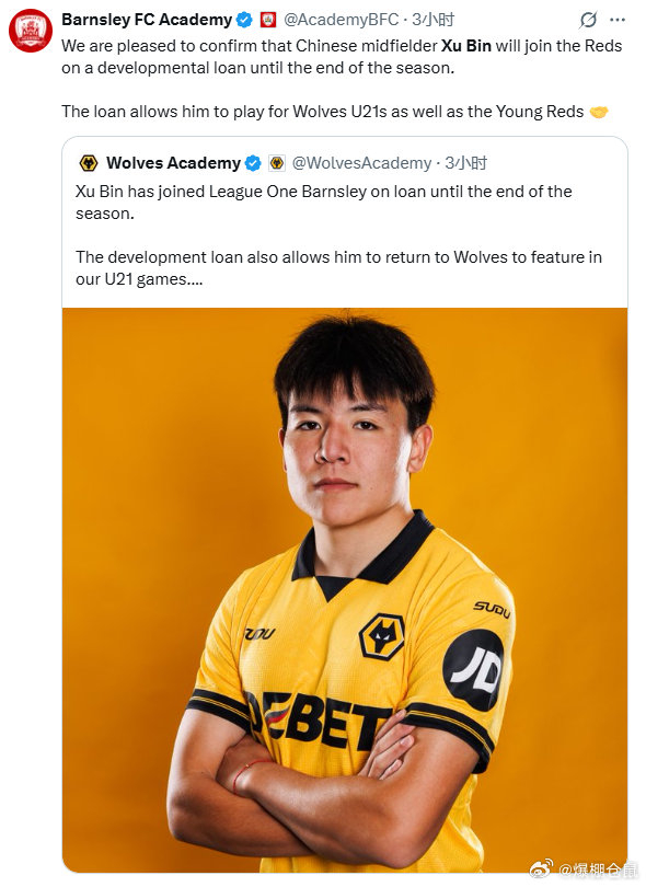 【官方】不久前加盟英超狼队的中国籍后卫徐彬租借至英甲的巴恩斯利,同时他还能代表狼队U21参加比赛,巴恩斯利目前排名英甲第14位。