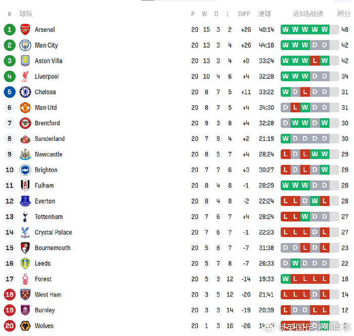 积分榜:曼城2连平落后阿森纳6分!切尔西距前四3分