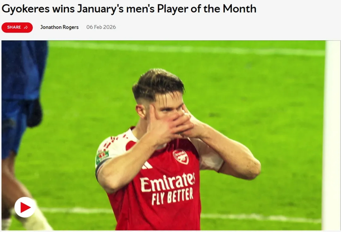 官方:阿森纳宣布哲凯赖什当选队内一月份最佳球员。