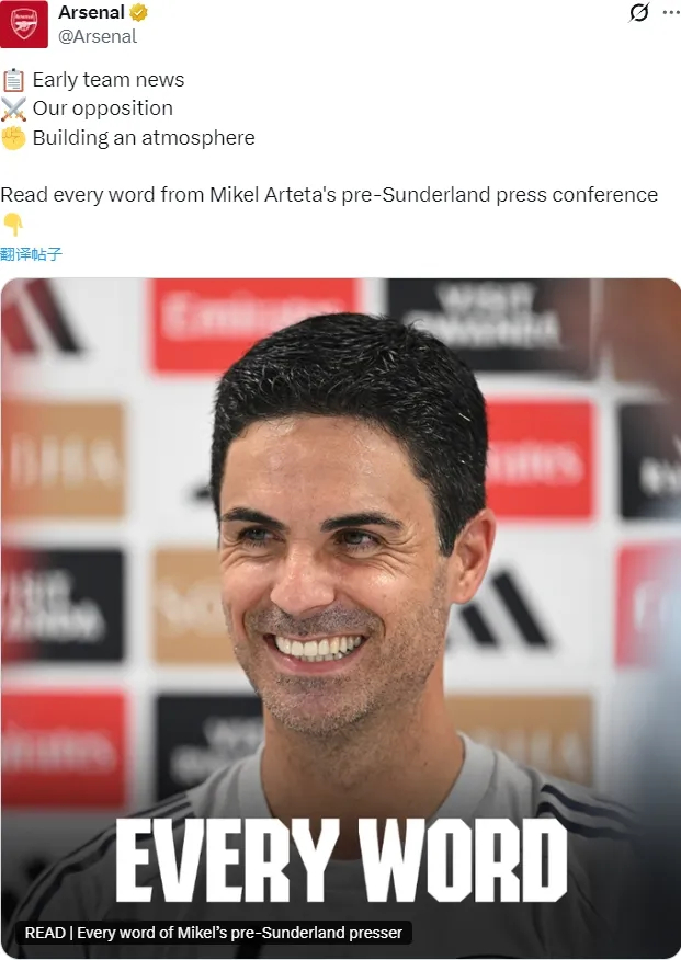 阿尔特塔出席了赛前新闻发布会,我们来看重要的消息。