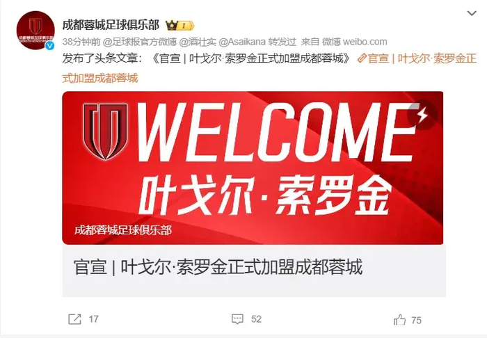 成都蓉城队在此时宣布索罗金加盟,对于其他争冠球队来说,无疑是当头一棒。