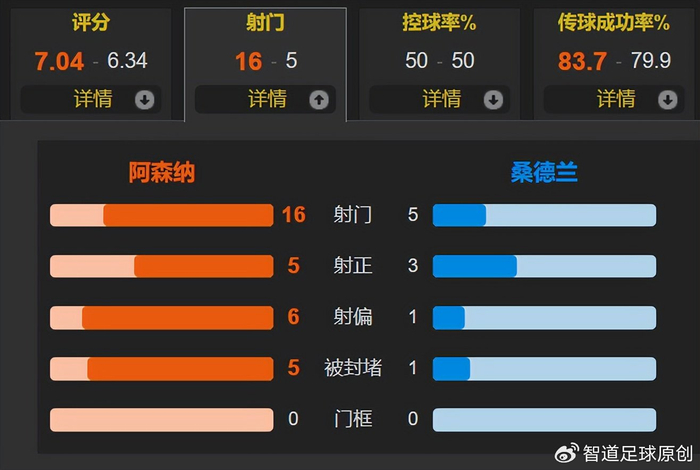 全场比赛,控球率五五开,阿森纳一共有16次射门,其中5次射正;桑德兰仅有5次射门,其中3次射正。其中约克雷斯2次射门2次射正打入2球,阿森纳需要利用和进一步开发瑞典中锋的身体和得分能力。