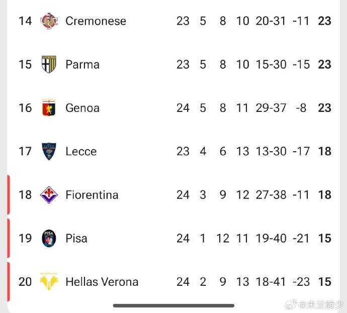 意甲这边也有点意思,佛罗伦萨终于冲出了降级区,不过跟少赛一场的莱切同分,后面还得努力,话说我早上5点多醒来看了一眼手机紫花还是2:1领先,没想到最后被绝平,看来指望紫花下半赛季搅局还是不太现实。紫花身前是帕尔马,帕尔马和克雷莫内塞都是少赛一场,领先紫花五分,热那亚同样23分,但是和紫花同样踢了24场,目前来看,莱切的压力应该是最大。不过有意思的是克雷莫内塞最近连续俯冲,排名第15了,保级压力突然就来,万一克雷莫内塞降级了,泰拉恰诺就要回来了,那米兰应该怎么处理他呢?