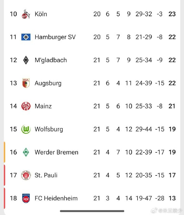 这周没有米兰的比赛,确实是无聊的,不过昨晚上看了一场我另外一个主队汉堡的球,时隔两个月终于赢球了,现在积22分,直接升到了11名,不过德甲的保级竞争非常激烈,从排名第十的科隆比降级区16位的不莱梅只多了4分,汉堡排11多三分,不过少赛一场,此外倒数第二名圣保利也只比前一名不莱梅少一分,除了排名垫底的海登海姆外,都有保级机会和降级危险,积分比较焦灼。
