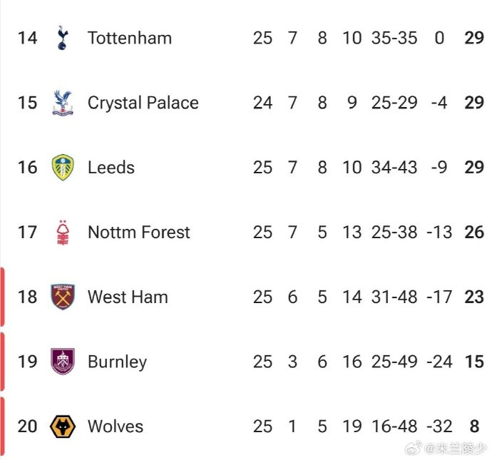 英超那边我的主队利兹也赢球,战胜了保级对手森林,拿下了关键的3分,积分甚至追平了热刺,英超这边除了垫底两名狼队和伯恩利外,最后一个降级名额也是比较焦灼的,西汉姆找回了状态,最近4场联赛赢了3场,距离排名第17的森林只差3分了,同积29分的有3支球队,分别是热刺,水晶宫和利兹联,利兹联比西汉姆只多6分,目前保级压力还是挺大的。